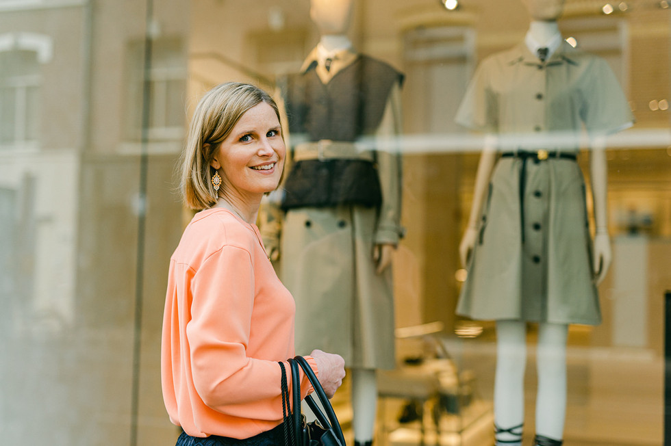 Sabine Walter ist Personal Stylistin in Amsterdam. Als wir uns zum ersten Business Portrait und Social Portrait trafen, hatte sie sich gerade mit ihrem Side Business selbständig gemacht und benötigte Fotos für ihre Website und Social Media. Für ihr Shooting kreierte ich ein ganz eigene Setting in einem leeren Showroom auf der Modemeile in Düsseldorf. Mode ist Sabines Welt. Sie ist nicht nur Fashion begeistert, sondern hat als Personal Stylistin ein Gespür und die Expertise für erfolgreiches Styling. Im hellen Showroom gestalteten wir ihre eigene kleine Modewelt mit ihrem Computer-Arbeitsplatz.